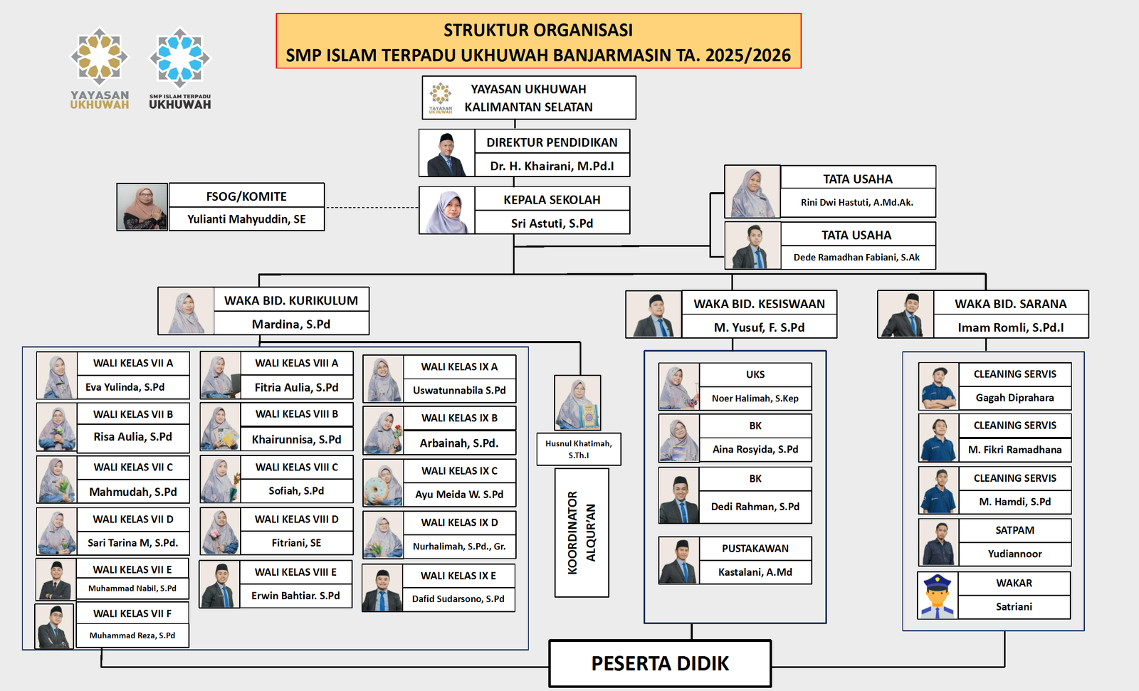 Para pendidik menjadi ujung tombak pembelajaran, membimbing siswa dengan kompetensi, keteladanan, dan semangat dakwah pendidikan. Sementara itu, peserta didik menjadi pusat dari seluruh aktivitas, tumbuh dalam lingkungan yang aman, islami, dan inspiratif. Bersama, struktur ini menghadirkan sinergi untuk mewujudkan generasi berkarakter, cerdas, dan berakhlak mulia.